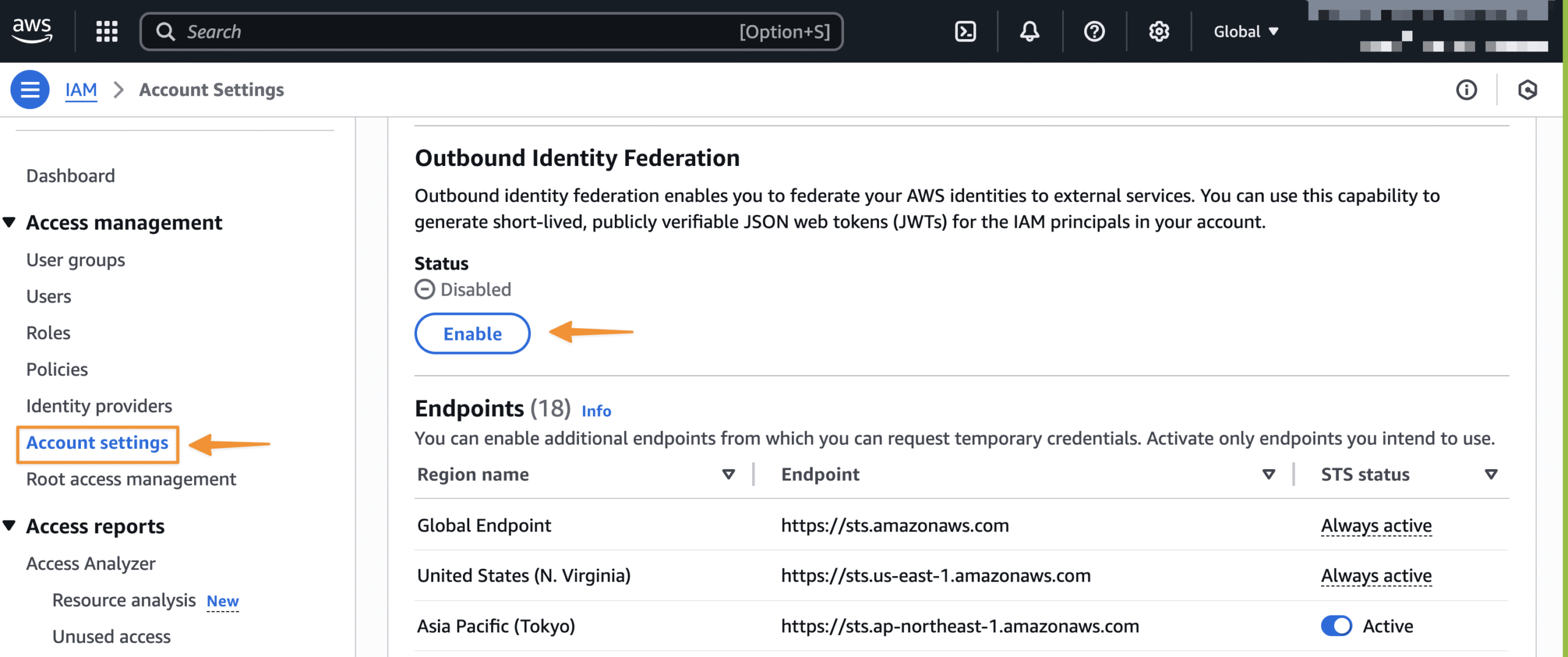 First, enable outbound identity federation in the IAM console within your AWS account settings. This action prompts AWS to generate a unique issuer URL for your account, which hosts the necessary OpenID Connect (OIDC) discovery endpoints.