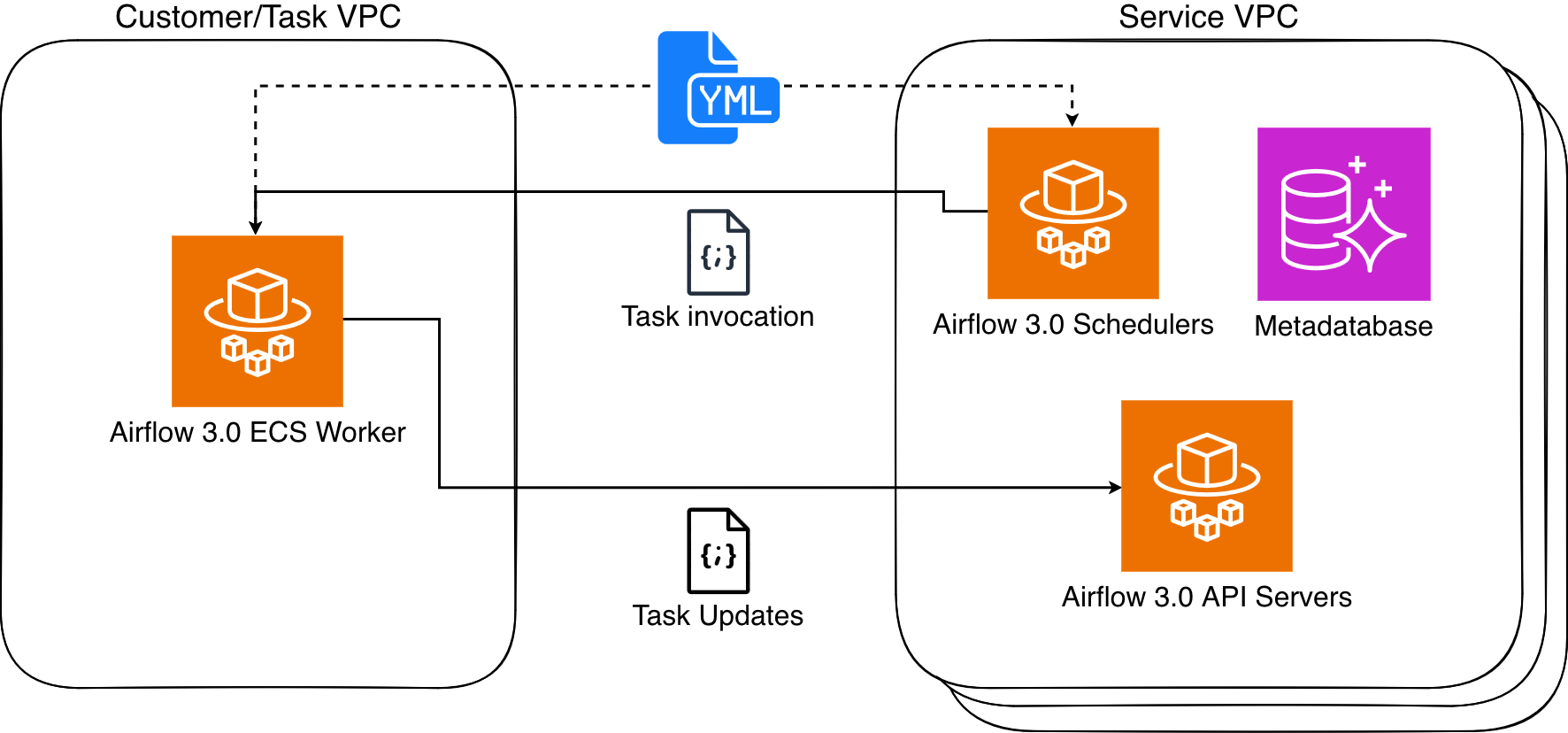 MWAA Serverless relies on Amazon Elastic Container Service (ECS) and Fargate to execute tasks in isolated containers, either within a customer’s VPC or a service-managed VPC. These containers communicate with the Airflow cluster using the Airflow 3 Task API.