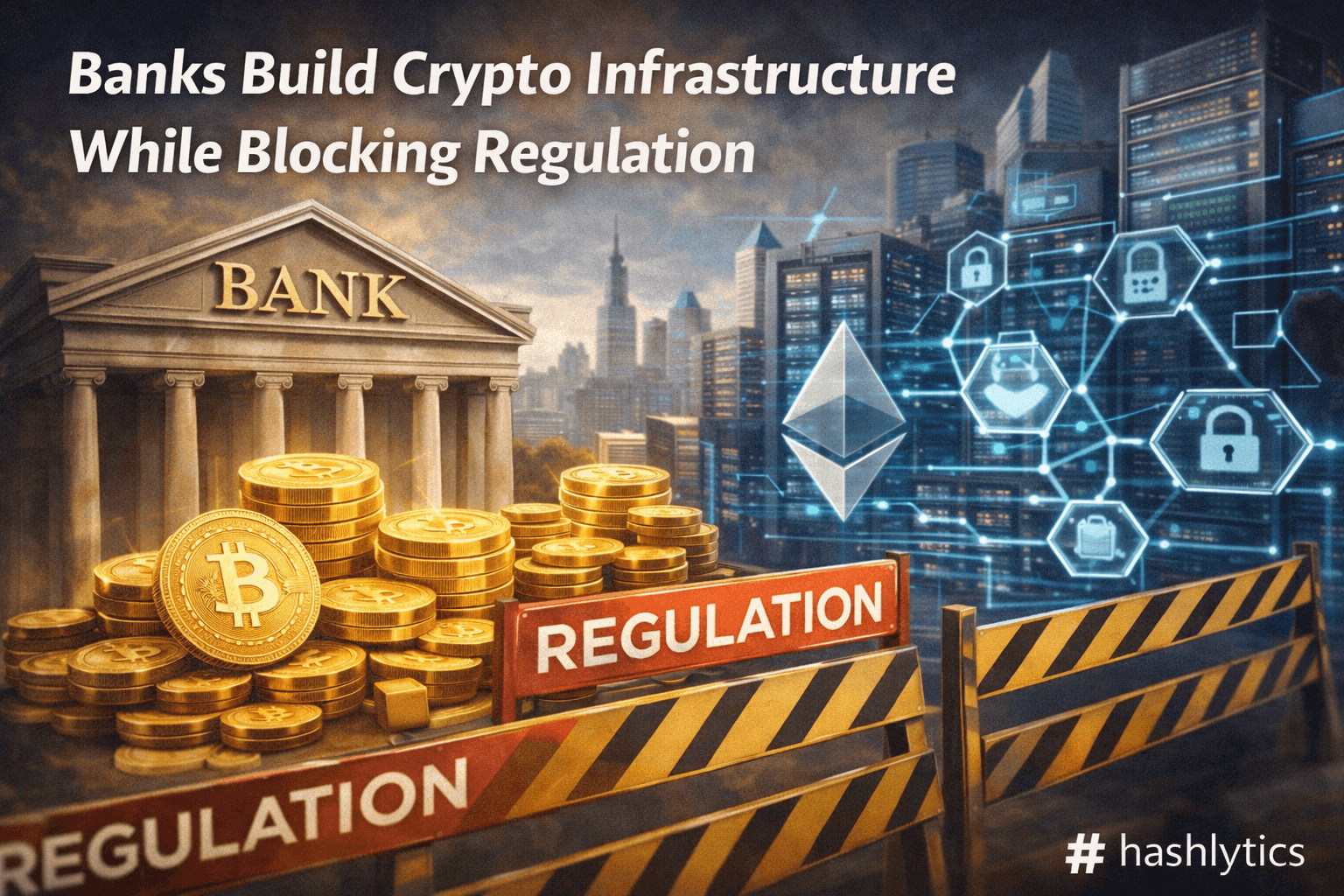This dual approach reflects a calculated positioning: build internal crypto capabilities while using regulatory obstruction as a moat against faster-moving competitors. Banks require clarity to operate blockchain services legally, yet their lobbyists push back against the very bills that would provide it.