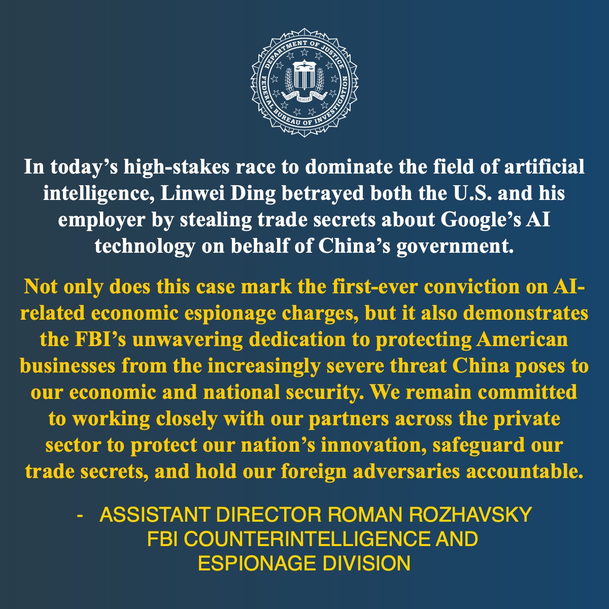 Assistant Attorney General John A. Eisenberg called the conviction a calculated breach of trust involving some of the most advanced AI technology in the world at a critical moment in AI development.
