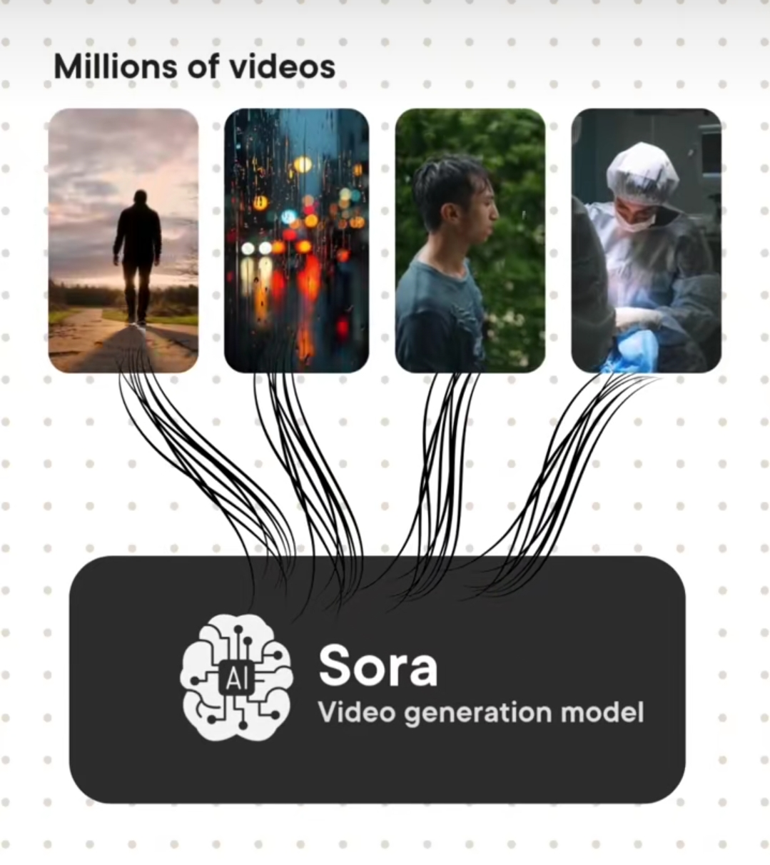 During training, Sora watches millions of hours of videos, but it doesn’t memorize pixels. Think of a master painter studying thousands of sunsets—they learn how light bends, how colors mix together, all the small details.