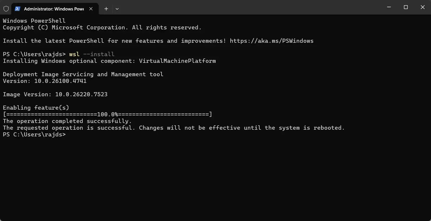 This command installs WSL2 and Ubuntu by default. Restart your computer when prompted.