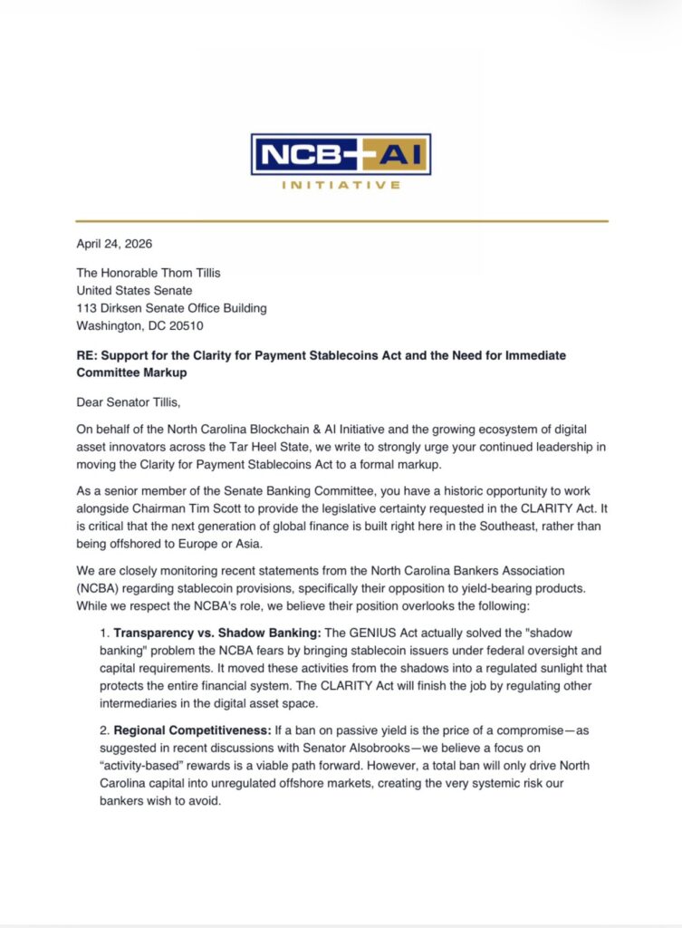 The North Carolina Blockchain & AI Initiative sent a formal letter urging Senator Tillis to schedule a committee markup for the CLARITY Act, framing the legislation as essential for regulatory clarity and competitive advantage. The group argues that Charlotte’s status as one of America’s largest banking hubs makes federal digital asset rules critical for keeping financial services rooted in the United States.