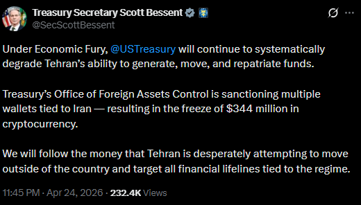 Treasury Secretary Bessent declared that US authorities are “systematically degrading Tehran’s ability to generate, move, and repatriate funds.” He warned that Middle East tensions continue to intensify, and the US will pursue all financial lifelines connected to the Iranian regime. “We will follow the money that Tehran is desperately attempting to move outside of the country and target all financial lifelines tied to the regime,” Bessent stated, signaling an escalation in crypto-focused sanctions enforcement.